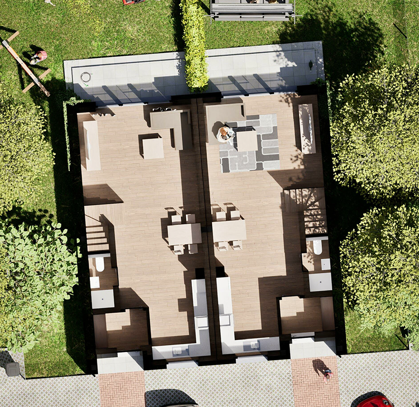 Ogromnym atutem są duże, prywatne ogrody, widoczne już z progu dzięki imponującym przeszkleniom w salonie. Tworzą one wyjątkowy efekt połączenia wnętrza z zielenią, zapewniając przestrzeń do zabawy dla dzieci, weekendowe grillowanie czy spokojny poranek z kawą – bez sąsiadów za ścianą w oknie naprzeciw.